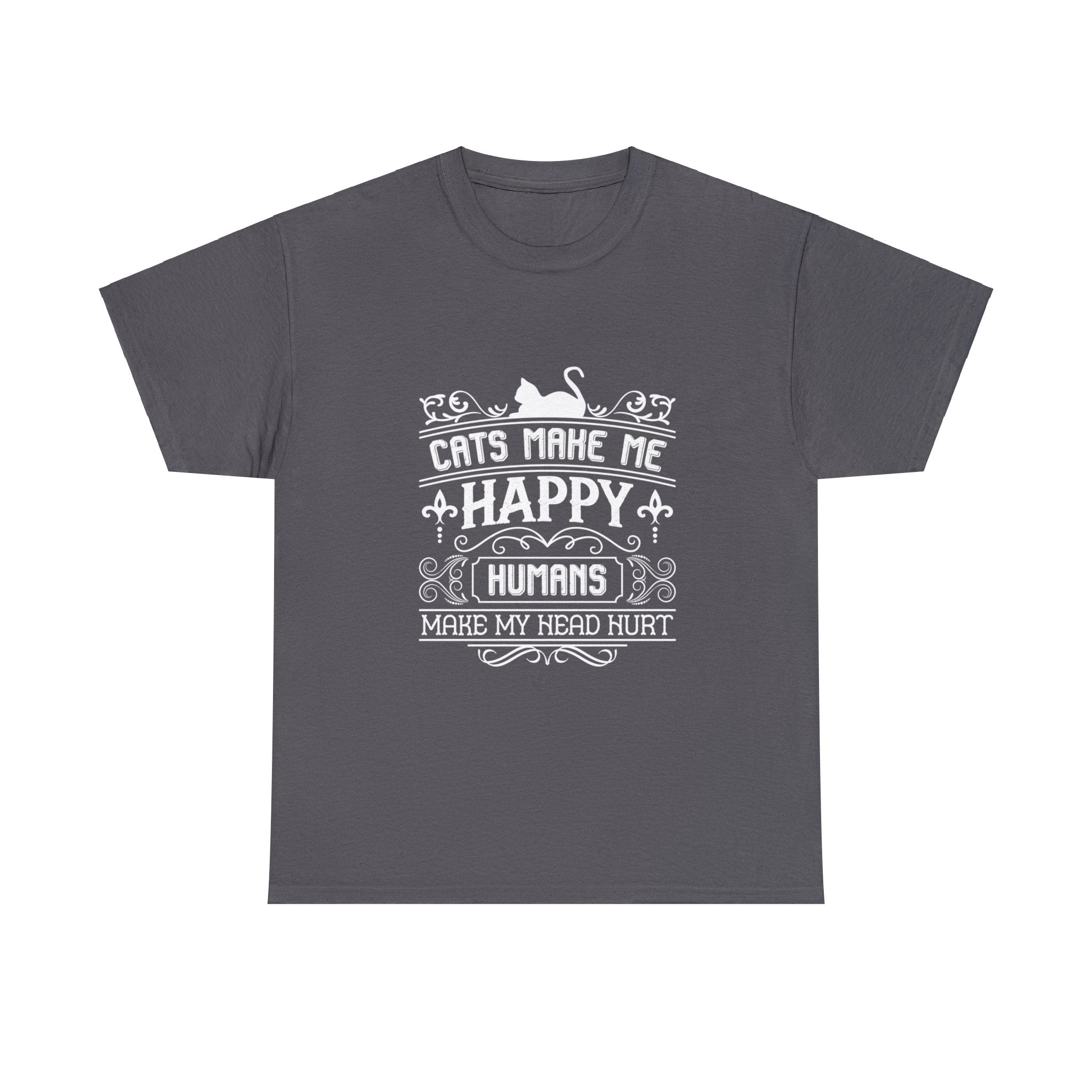Inject some humor into your wardrobe with the ''Cats Make Me Happy, Humans Make My Head Hurt T-Shirt.'' This tee is more than apparel; it's a playful reflection of your love for felines and the occasional complexities of human interactions. Designed for both comfort and style, it lets you wear your quirky sense of humor with pride. As you drape yourself in this shirt, let it serve as a lighthearted reminder that cats bring you joy while navigating human relations might sometimes be a headache.