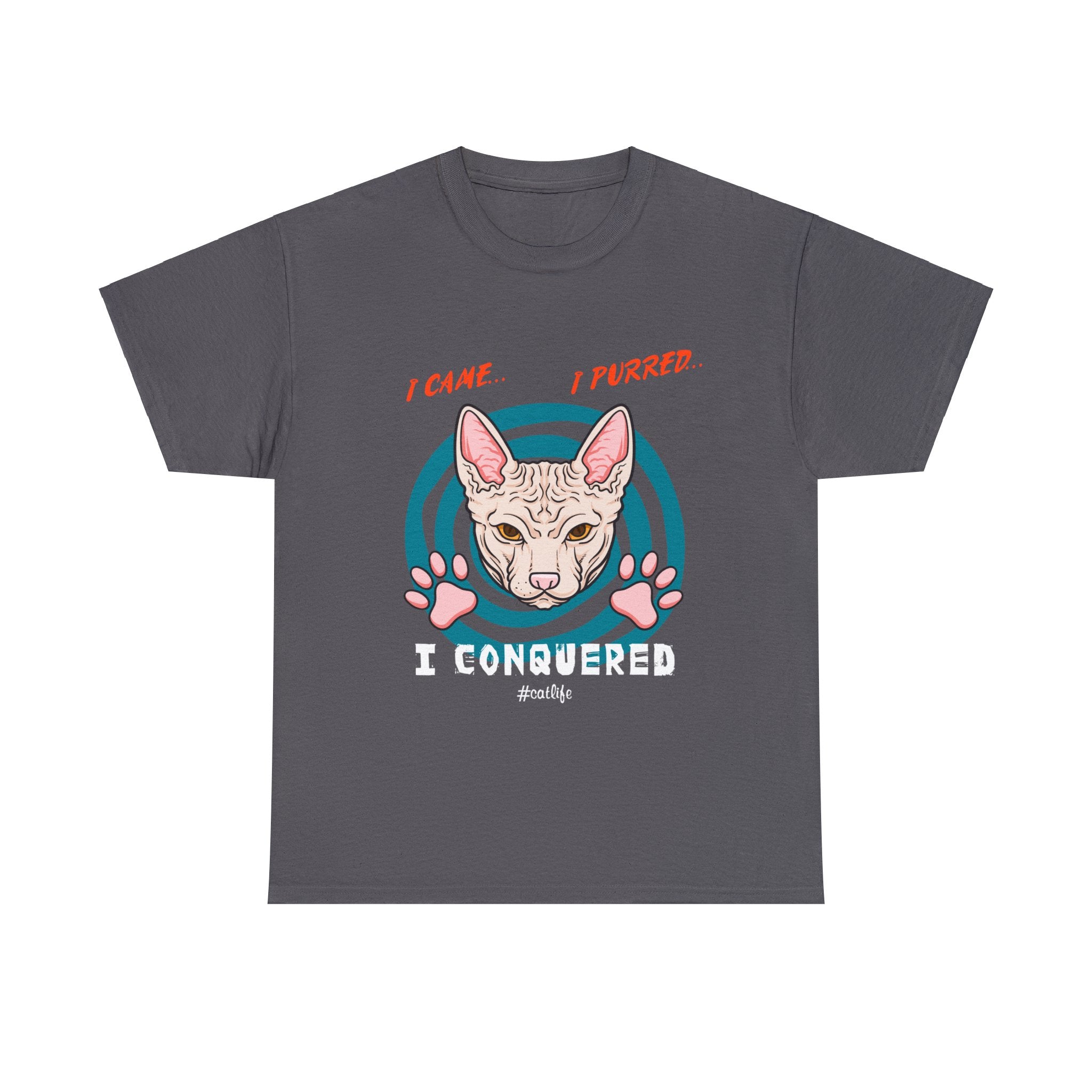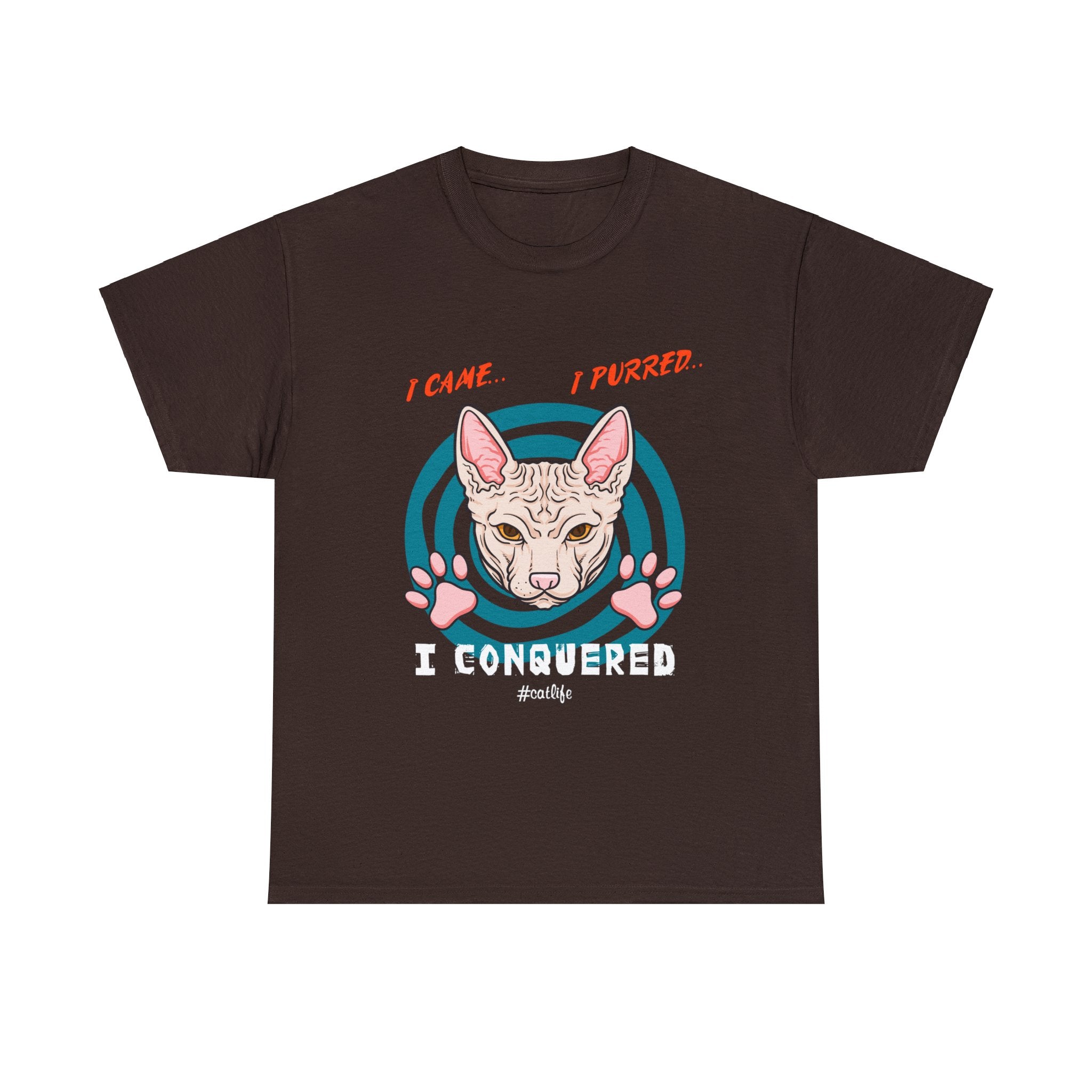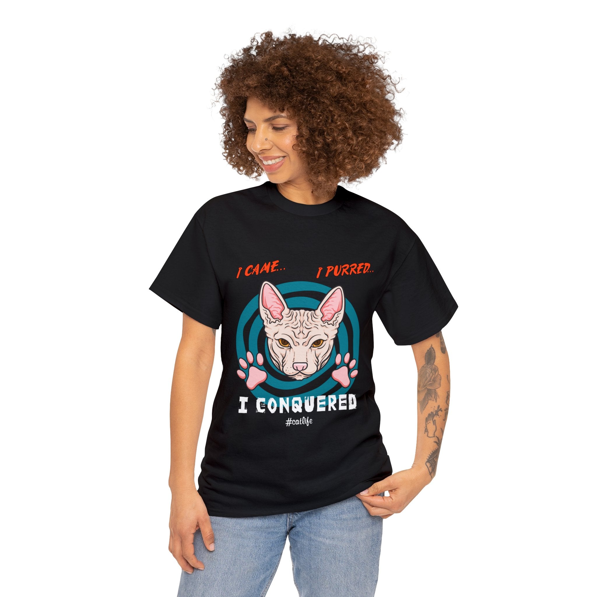 Claim your feline dominance with this playful and confident tee that celebrates the unapologetic spirit of cats. This eye-catching design features a regal cat silhouette and the inspiring words "I Came, I Purred, I Conquered" in an eye-catching font. Whether you're strutting through the streets or lounging at home, this shirt will let everyone know that you're a proud cat enthusiast who appreciates the feline spirit of power and independence.