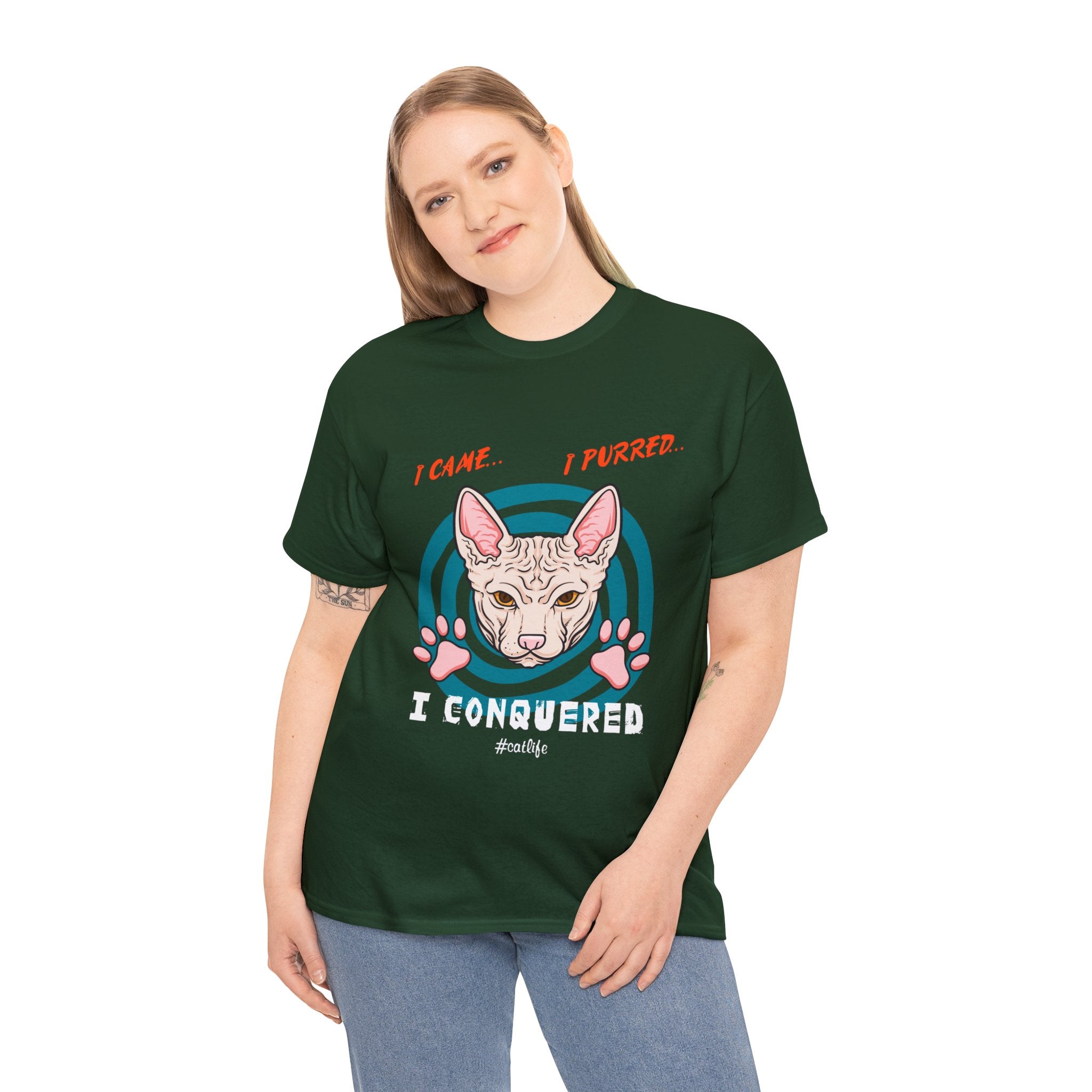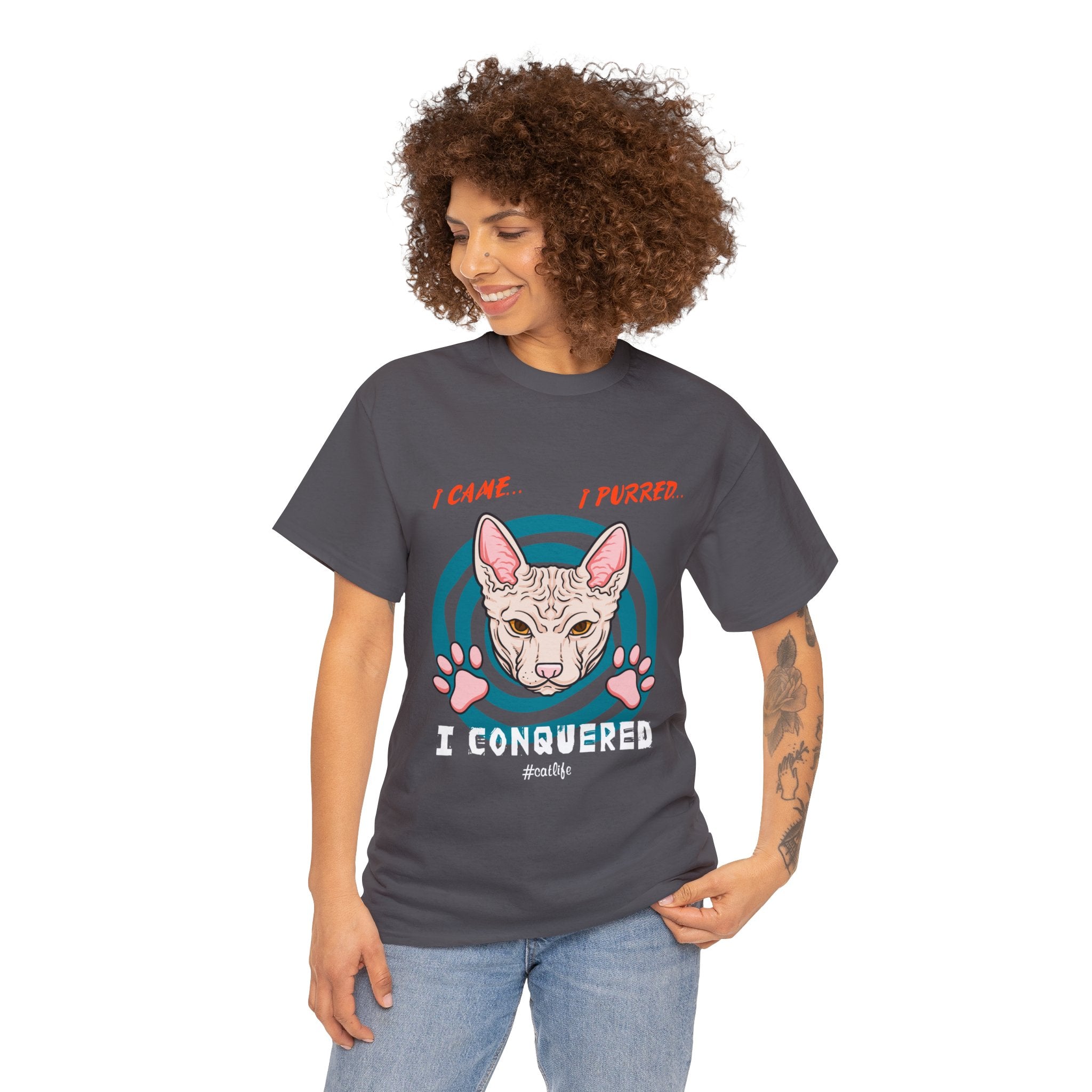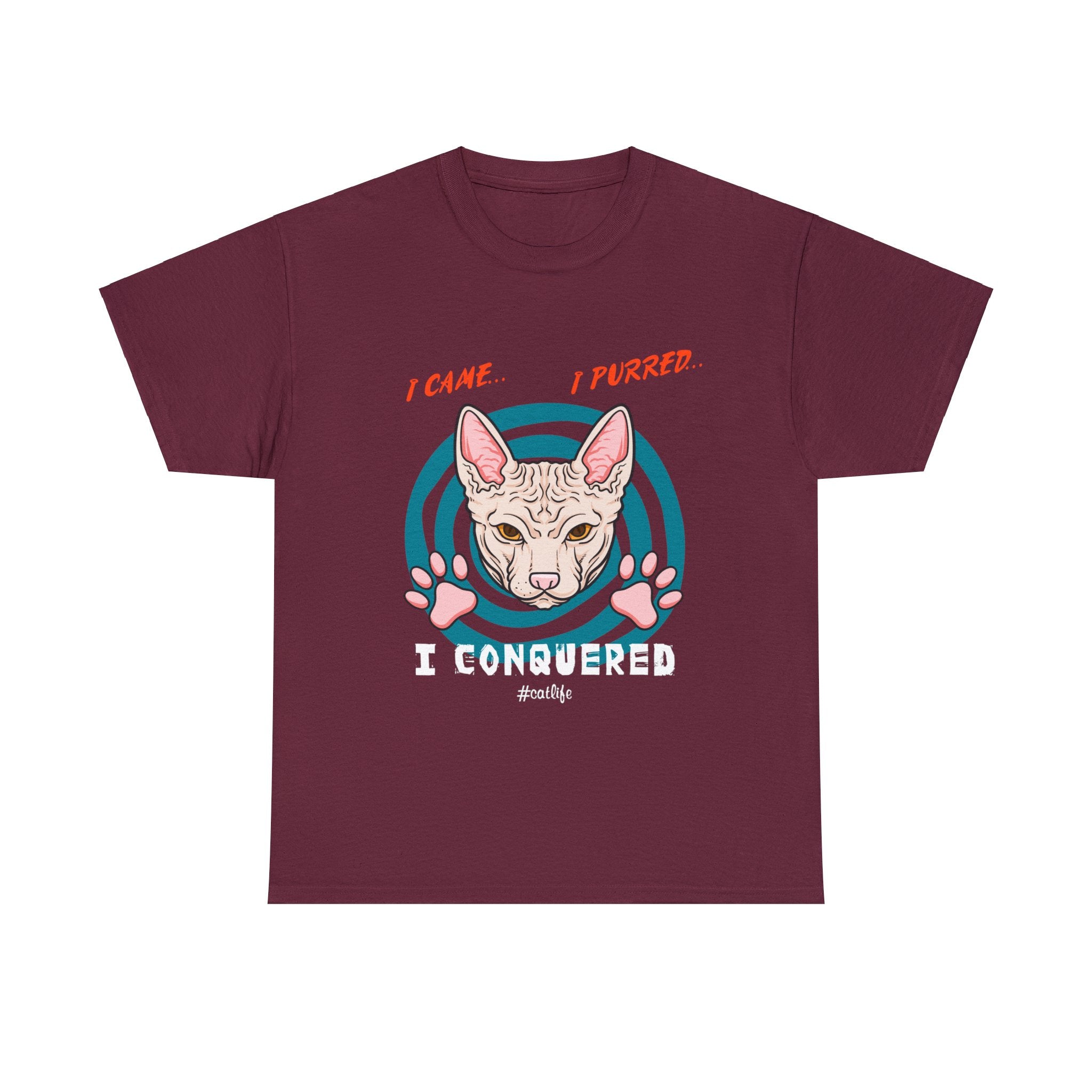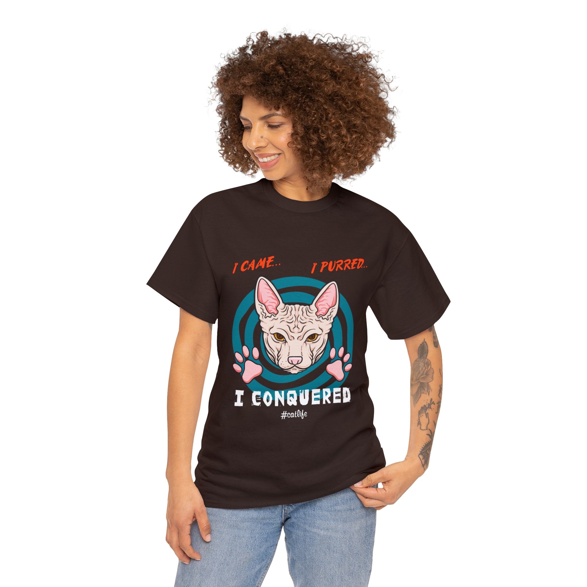 Claim your feline dominance with this playful and confident tee that celebrates the unapologetic spirit of cats. This eye-catching design features a regal cat silhouette and the inspiring words "I Came, I Purred, I Conquered" in an eye-catching font. Whether you're strutting through the streets or lounging at home, this shirt will let everyone know that you're a proud cat enthusiast who appreciates the feline spirit of power and independence.
