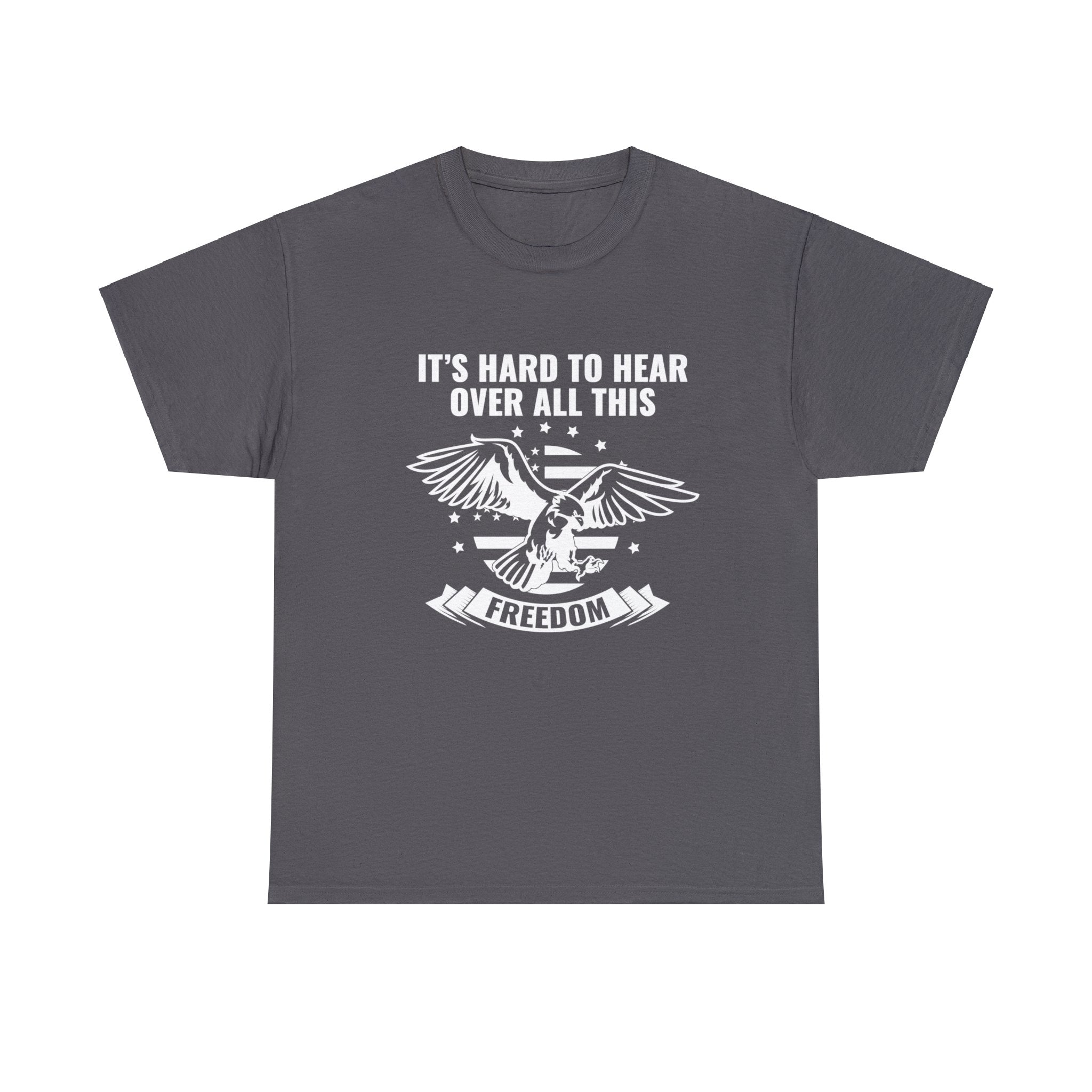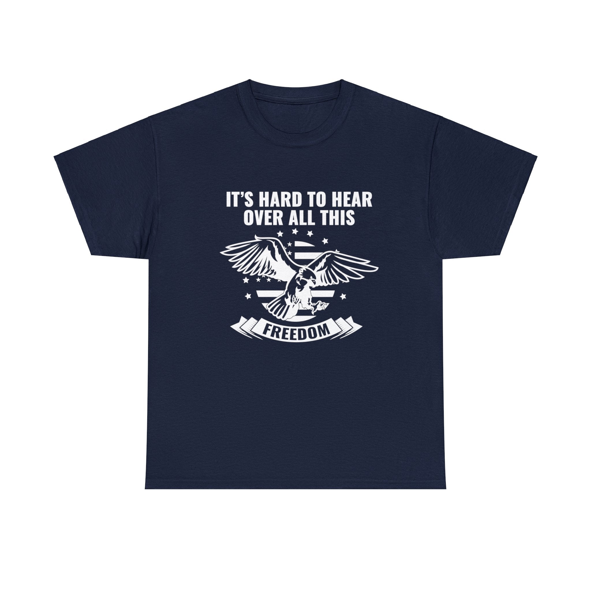 Immerse yourself in a comedic odyssey to liberty with our "It's Hard to Hear Over All This Freedom T-Shirt"—an ensemble that skillfully harmonizes humor with unabashed patriotism. This shirt is more than fabric; it's a cheeky proclamation of freedom's overwhelming presence in your life. Picture your style as a whimsical dance, each step drowning out the monotonous beats of everyday life with liberating laughter—an anthem to the joy found in the abundance of freedom.