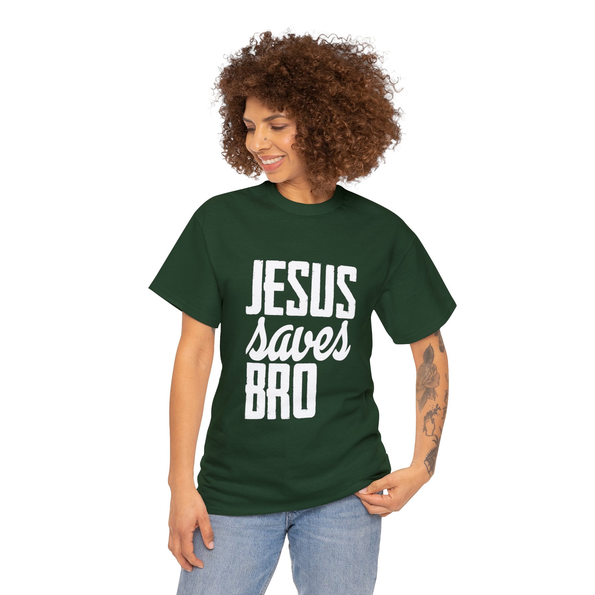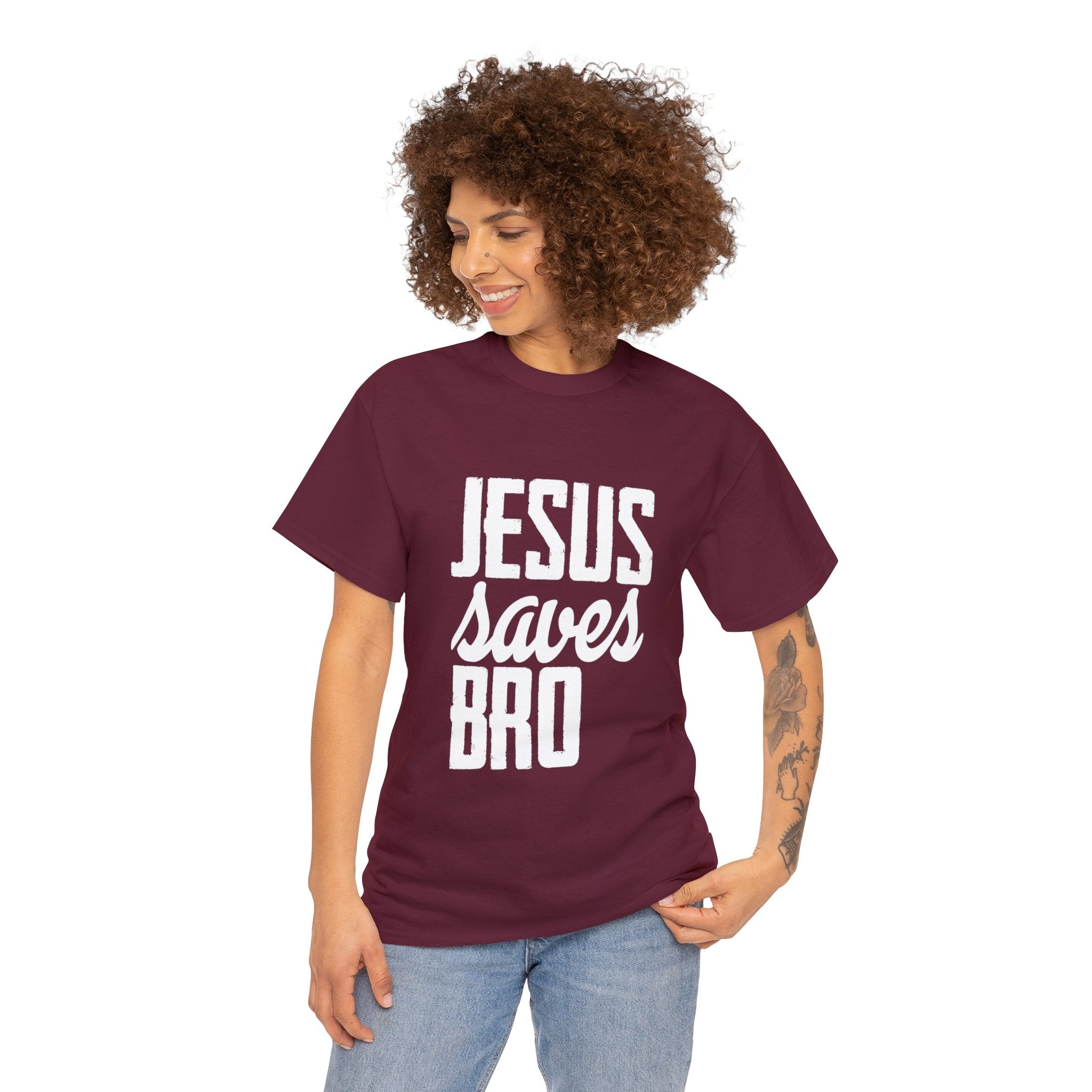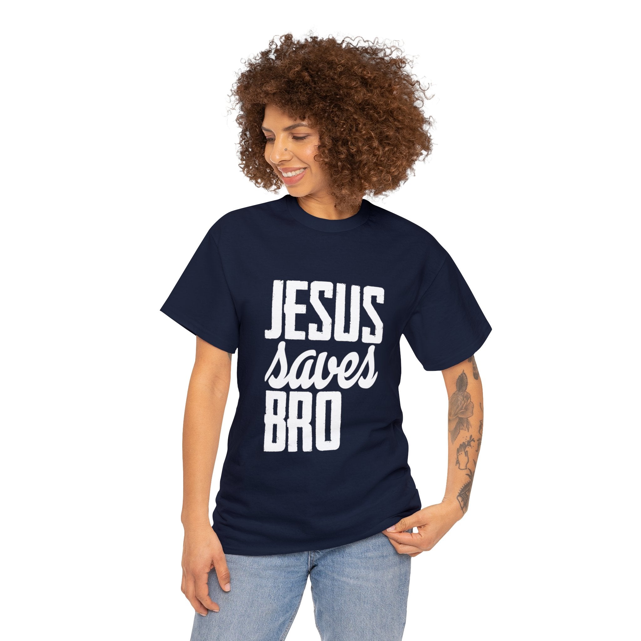 Make a faith statement with a touch of humor with our ''Jesus Saves, Bro T-Shirt.'' This tee is more than just clothing; it's a declaration of salvation designed for ultimate comfort and durability. Wear it proudly, knowing you're not only spreading the message of redemption and hope but doing so with a lighthearted touch that can engage and inspire others. Let your clothing make a memorable statement about your faith journey and your sense of humor.
