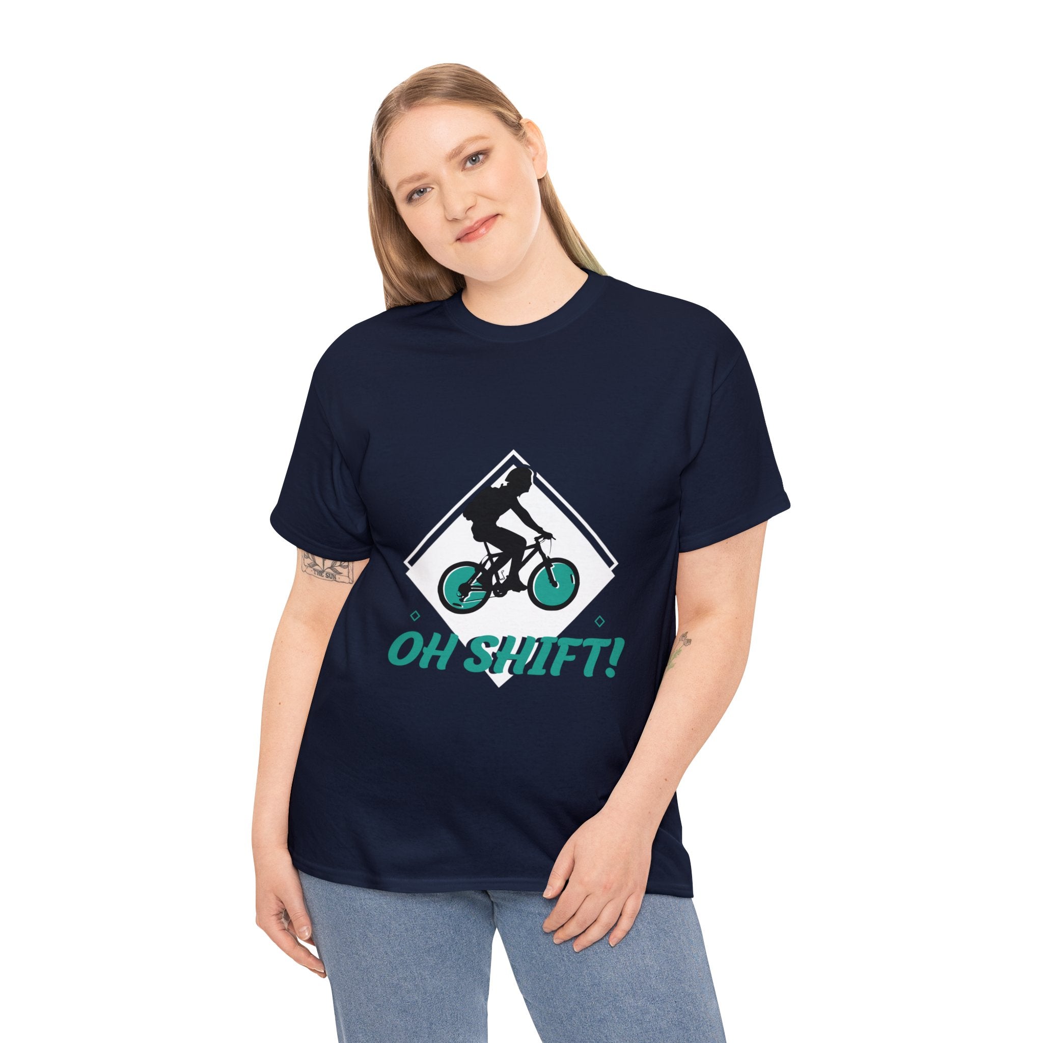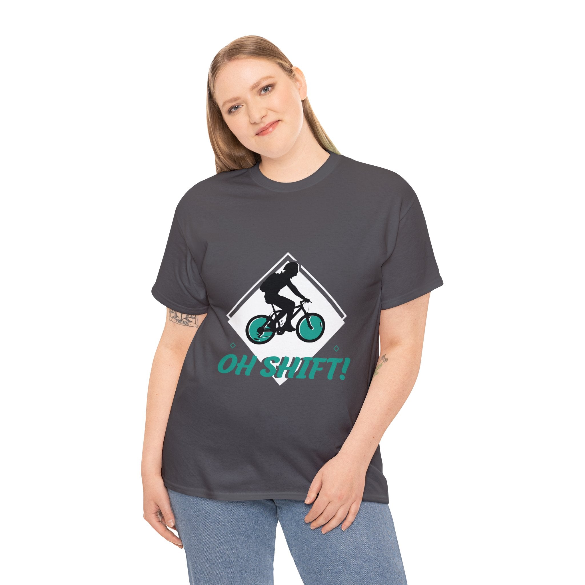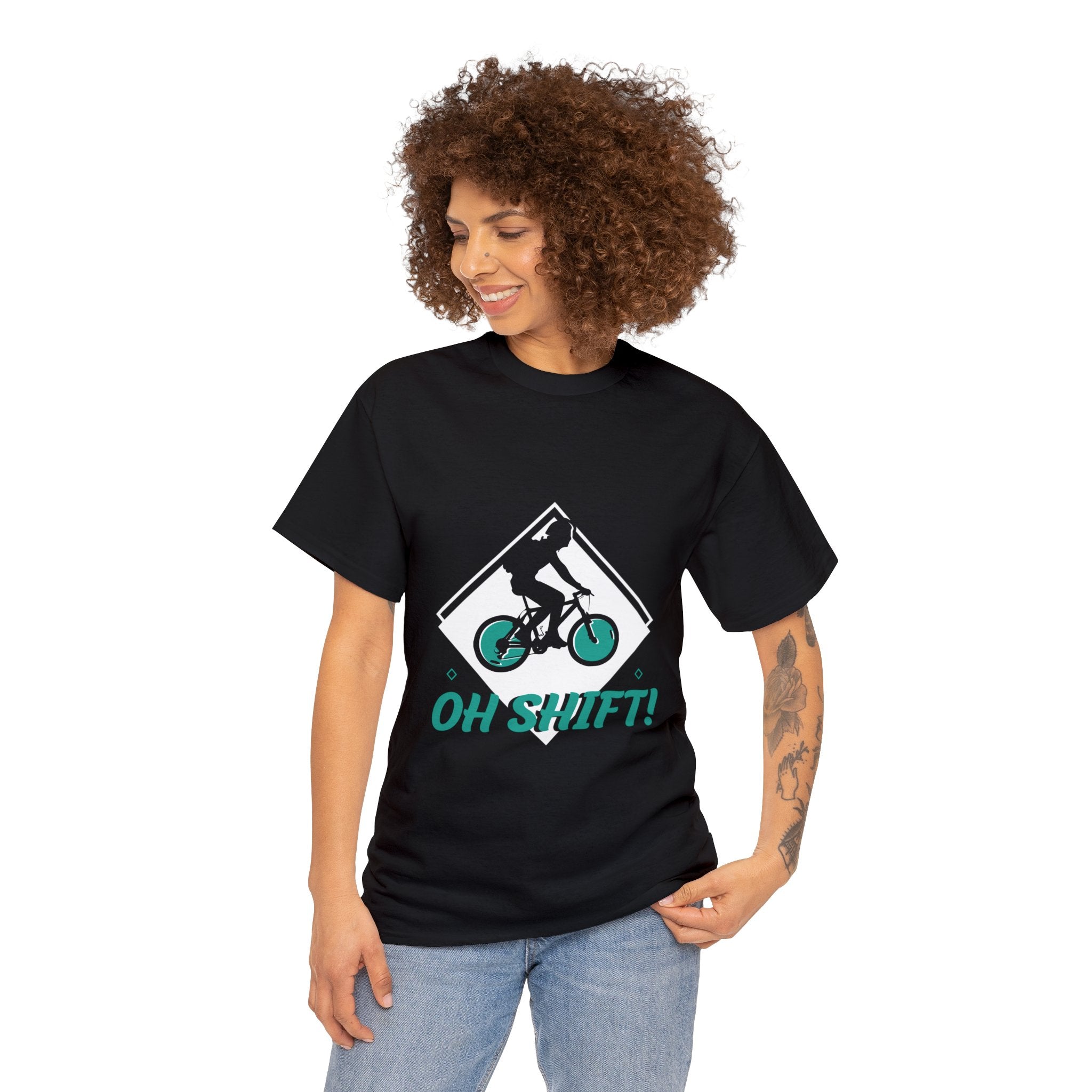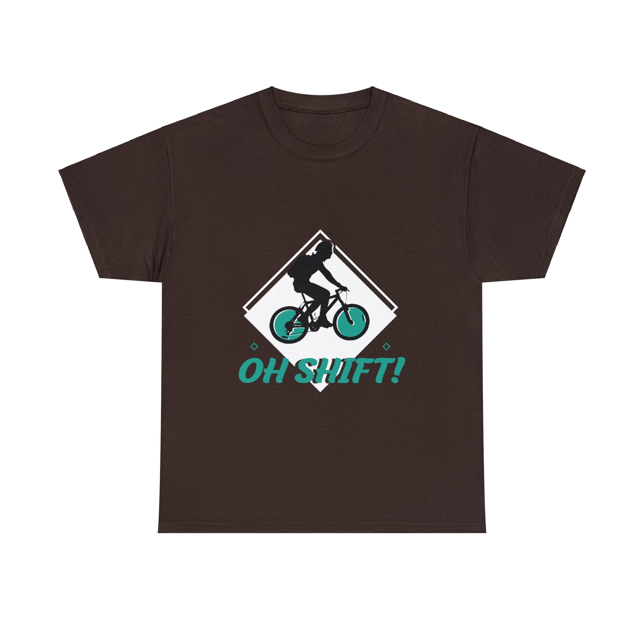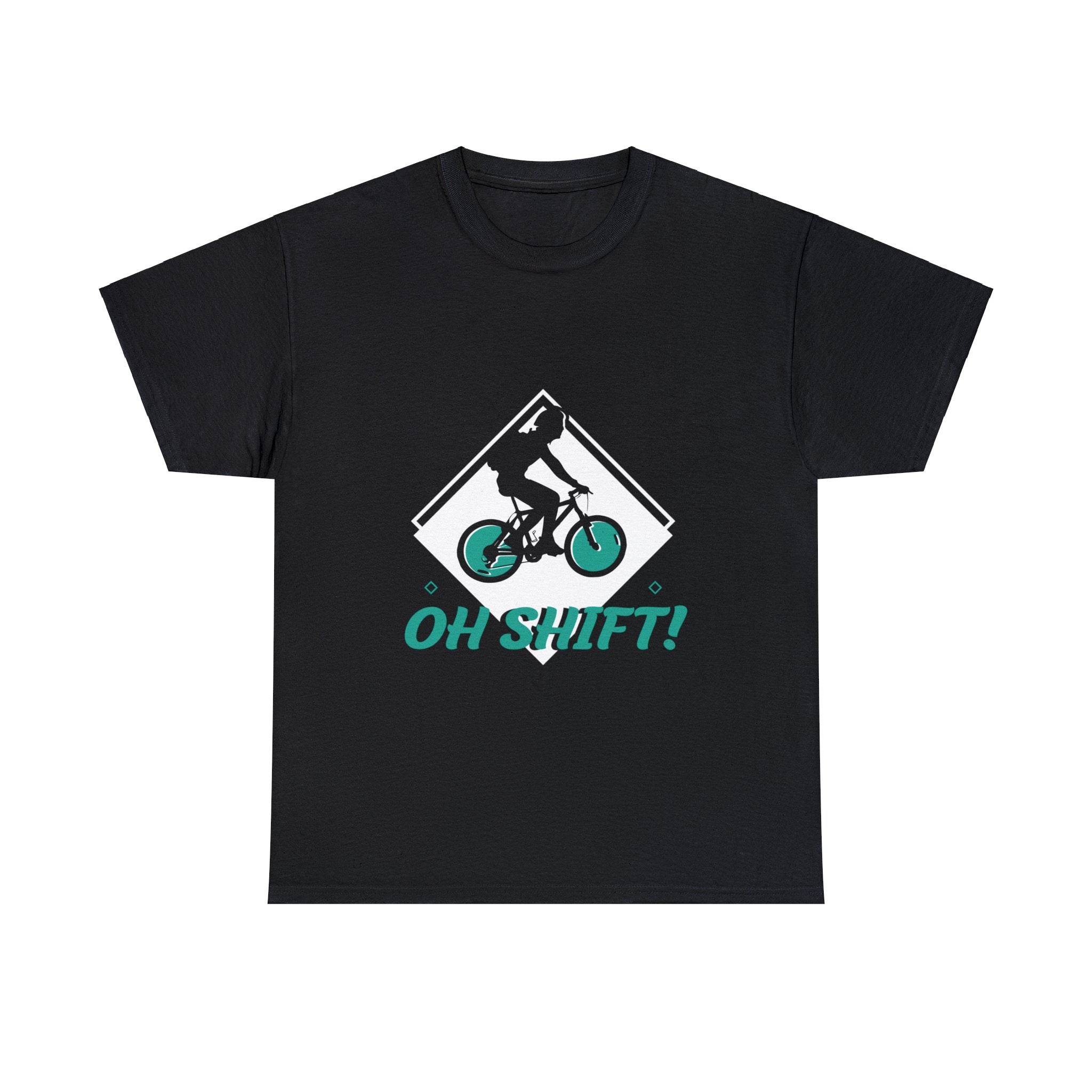 Embrace the occasional mishaps that come with cycling and add a touch of lightheartedness to your rides with this witty "Oh Shift T-Shirt." Made from soft cotton, this tee is comfortable for any journey, whether you're cruising down city streets or conquering mountain trails. The playful design, featuring a cyclist struggling with a gear shift, pokes fun at those moments when things don't go quite as planned. Let it remind you to laugh at yourself, take a deep breath, and enjoy the ride.