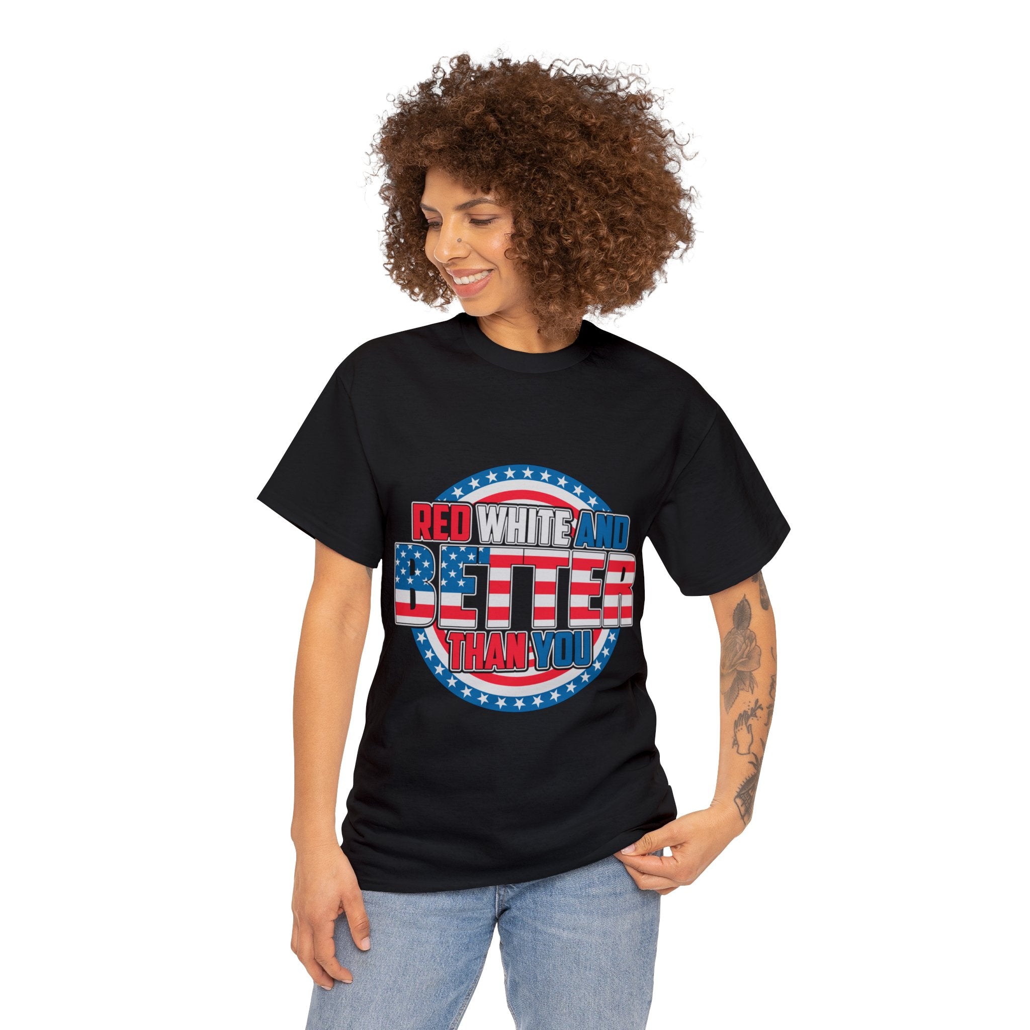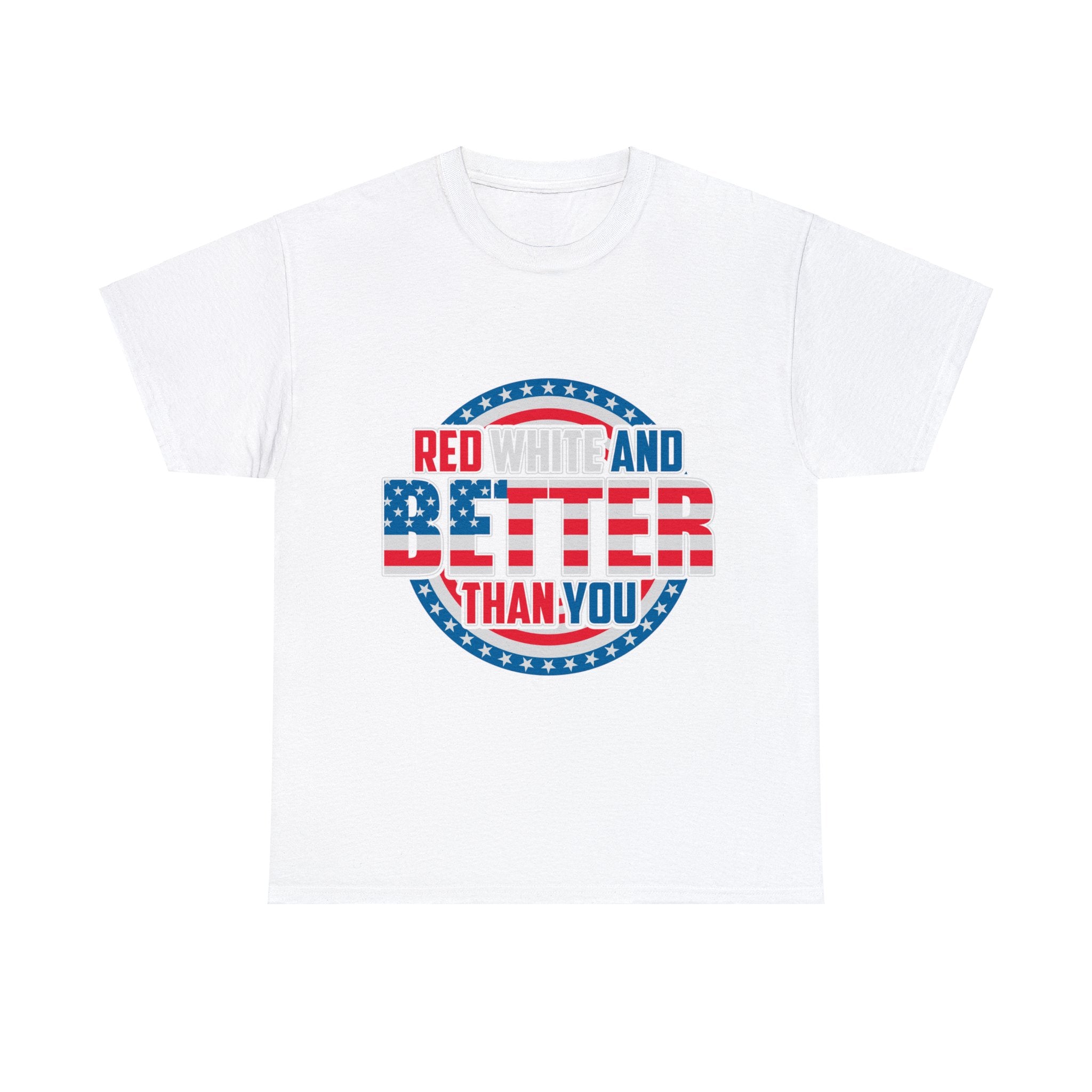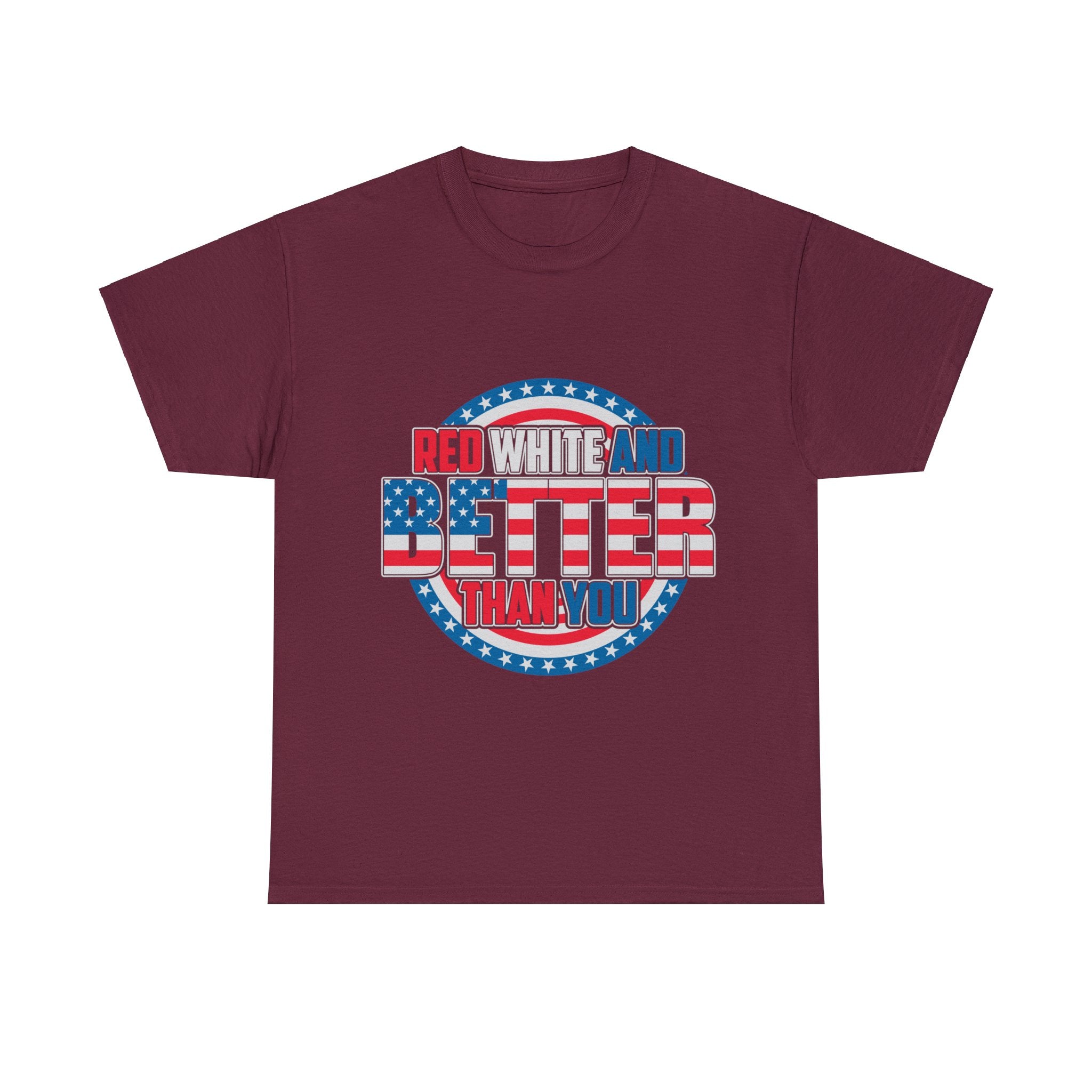 Embrace unapologetic pride with our "Red White And Better Than You T-Shirt" – a vibrant declaration where each hue signifies an aspect of American greatness. This isn't just fabric; it's a living palette of patriotism, confidently declaring that in the spectrum of nations, red, white, and blue reign supreme.