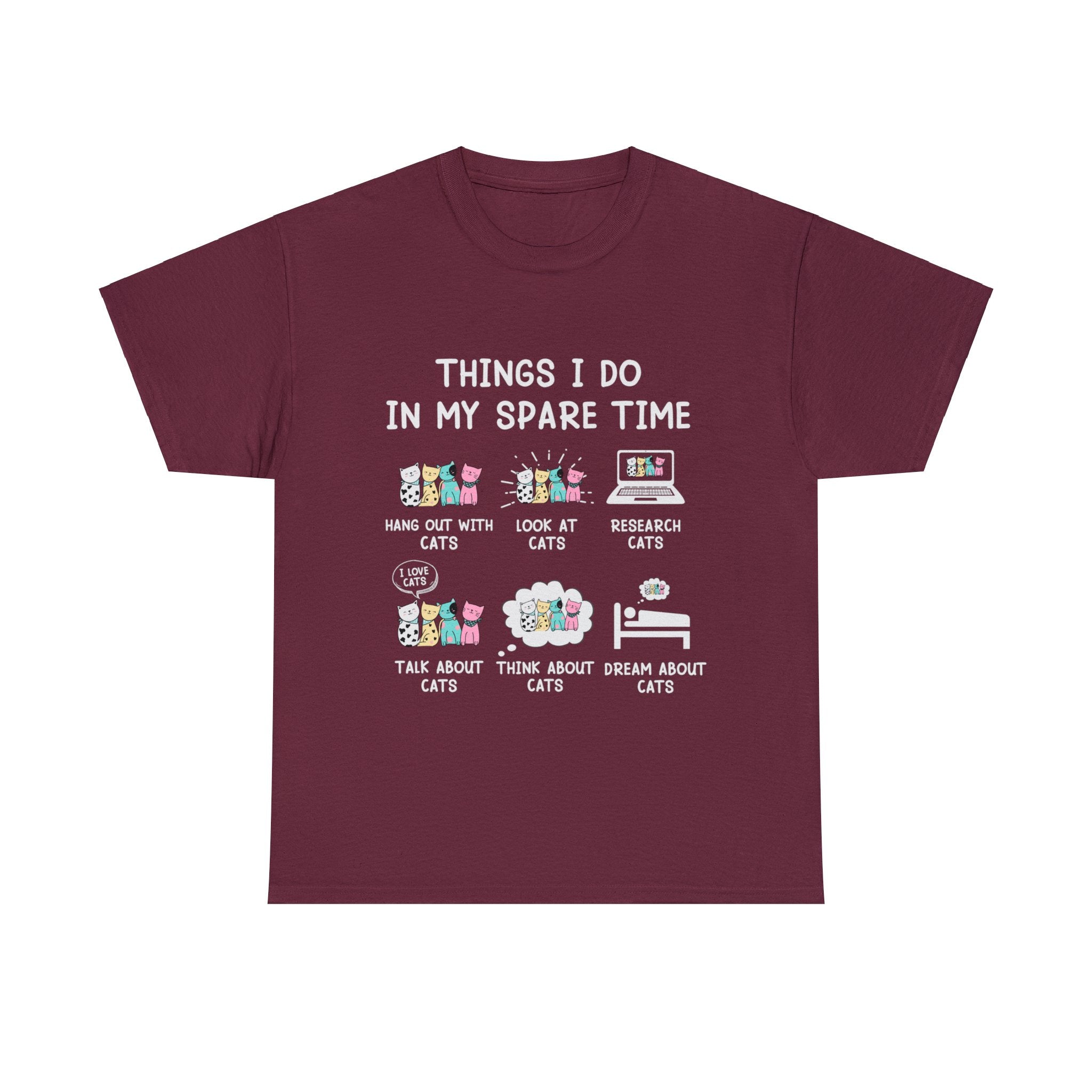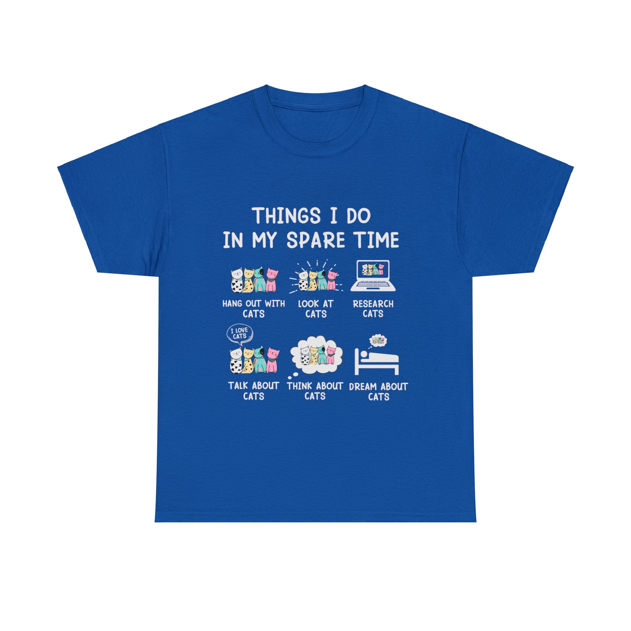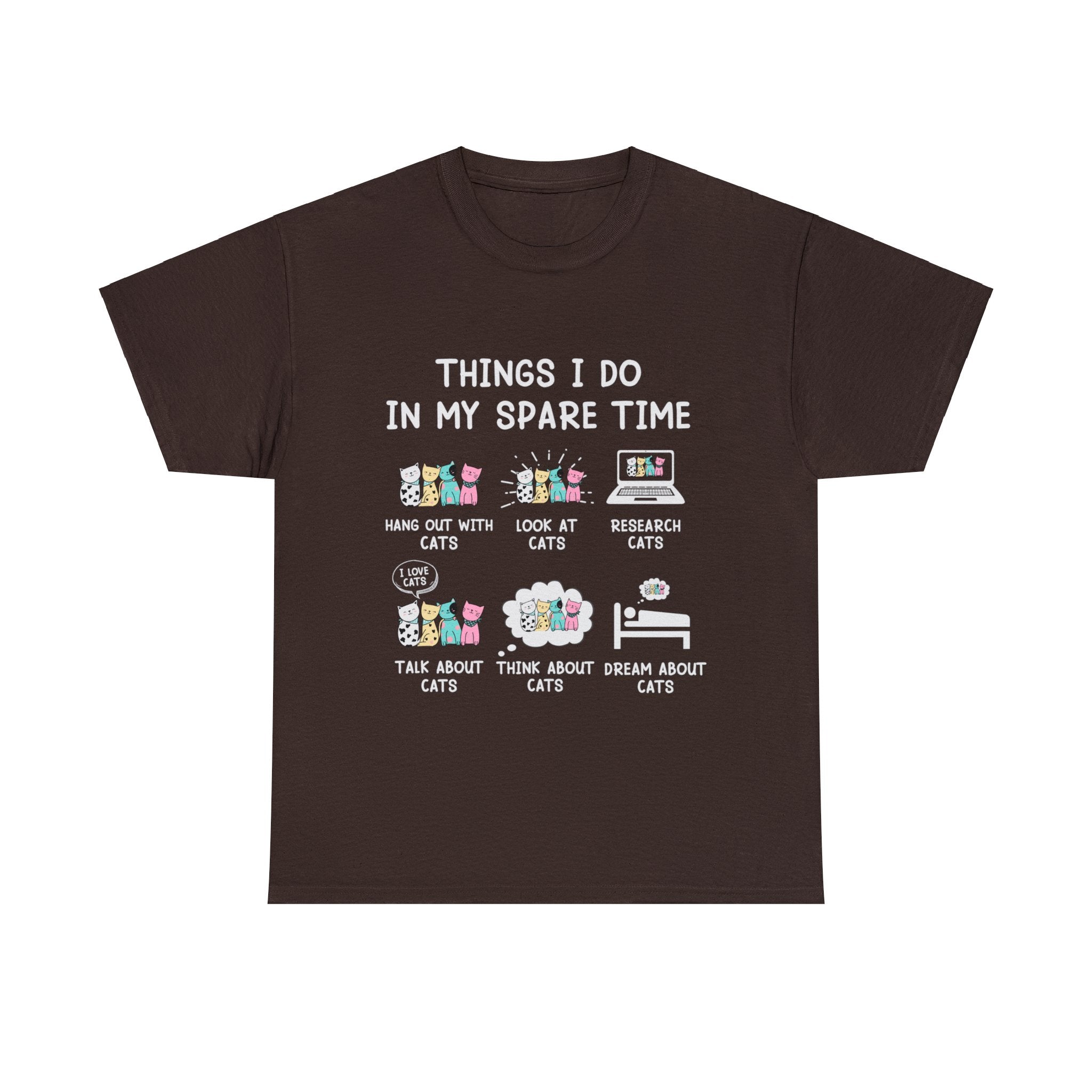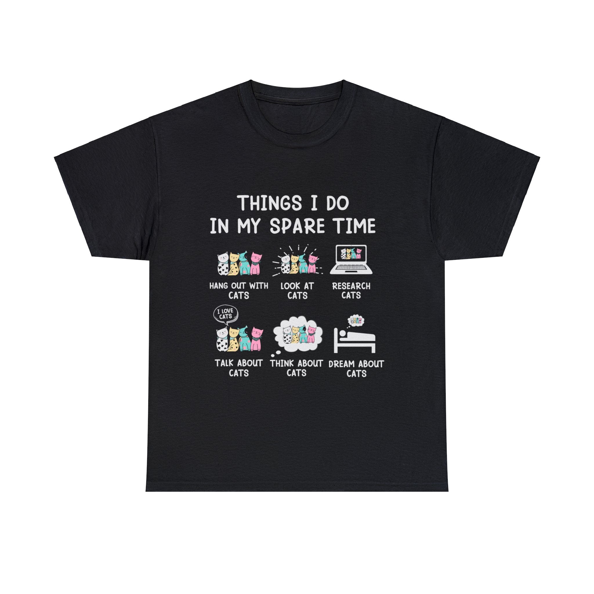 Reveal the delightful secrets of your feline-filled world with our ''Things I Do in My Spare Time T-Shirt.'' This isn't just clothing; it's a playful proclamation of your devotion to all things cat-related. Crafted for both comfort and style, it allows you to wear your love for cats with pride. As you drape yourself in this shirt, let it be an open book to the 'purrfect' pastimes that involve your whiskered companions, inviting fellow cat lovers into your world of feline fun and frolic
