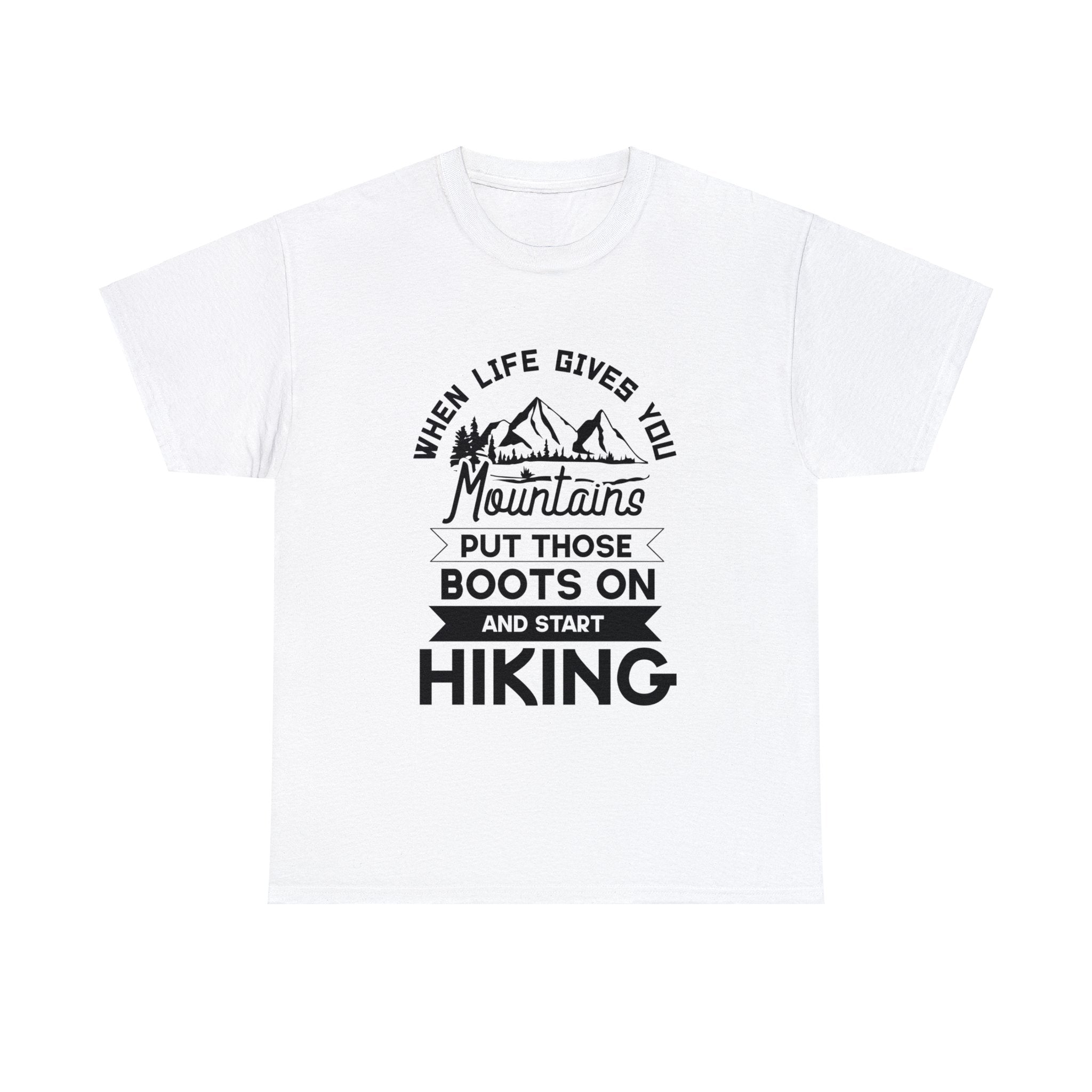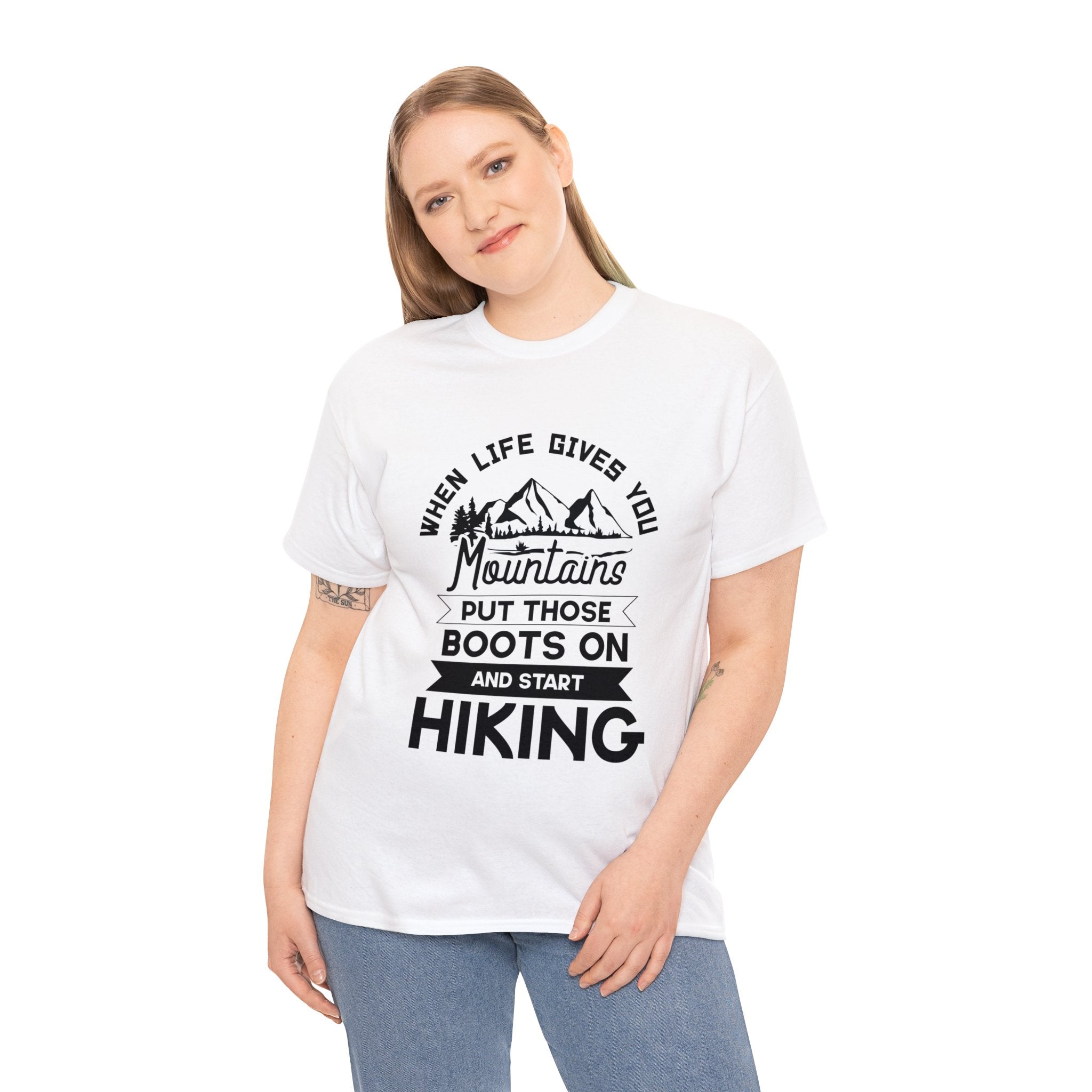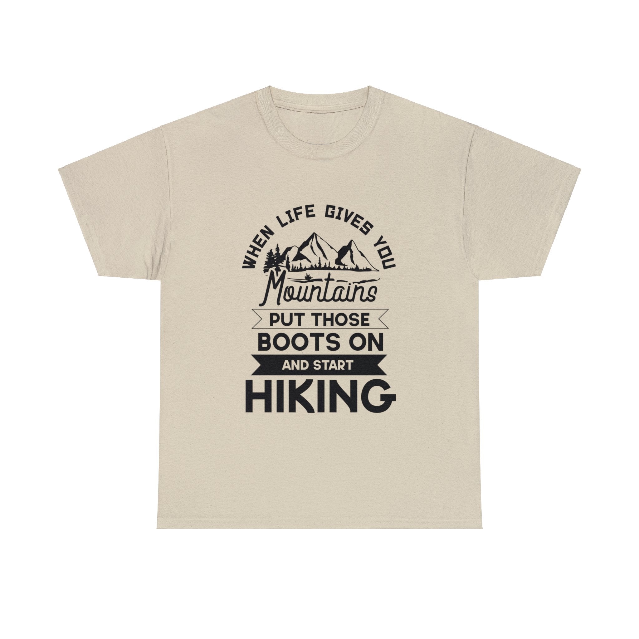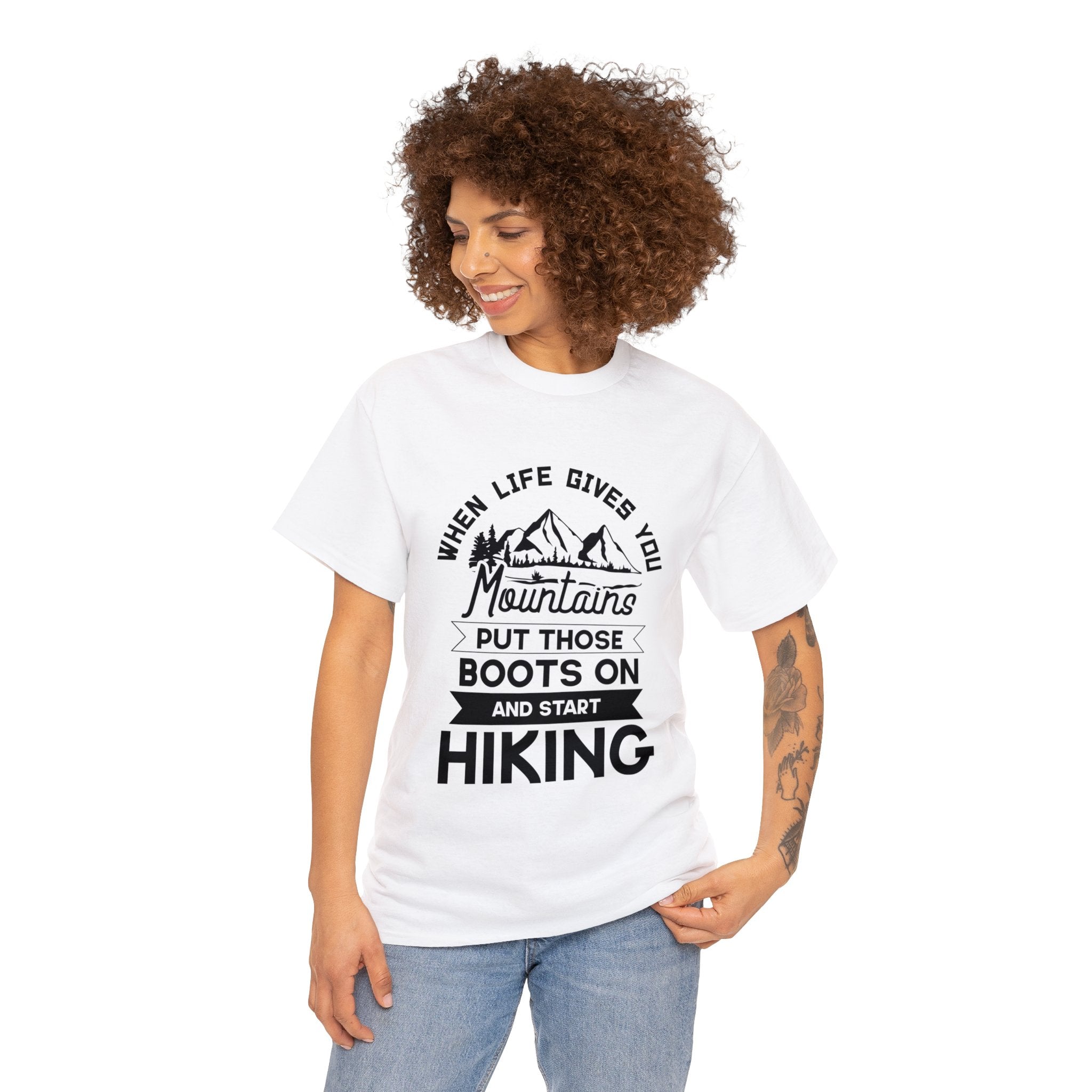 Ready to conquer life's mountains, one hike at a time? Our ''When Life Gives You Mountains, Put Those Boots On and Start Hiking T-Shirt'' is your ultimate companion for those who face challenges head-on, with a dash of adventure. This tee adds a playful twist to your resilience and determination, making it more than just clothing; it's a lighthearted declaration of your readiness to tackle life's peaks with unwavering spirit.